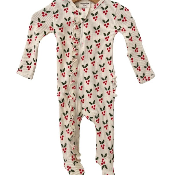 This cozy, holiday-ready footie features a convenient two-way zipper for quick and easy diaper changes, making life a little easier for parents. Made from 100% organic cotton, it’s soft, breathable, and gentle on your baby’s delicate skin, while the subtle waffle texture provides warmth and stretch. The Holly print adds a festive, seasonal touch, perfect for snuggling, holiday photos, or spreading Christmas cheer all winter long. Features: * Material: 100% Organic Cotton (soft, breathable, and kind to sensitive skin) * Design: Convenient 2-Way zipper * Footed Design: Keeps baby’s feet warm and cozy * Eco-friendly: Made with sustainably sourced, organic cotton * Easy Care: Machine washable cold for quick and easy clean-ups, lay flat to dry * Fold-over Cuffs: Protect baby’s hands and keep them warm